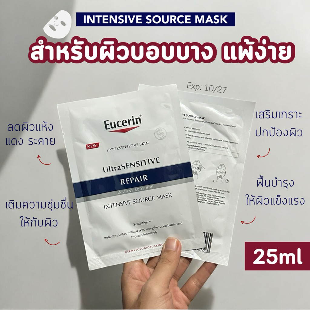 Eucerin Ultra Sensitive Repair Instant Soothing Intensive Source Mask5 Sheet Masks มาส์กหน้าผิวชุ่มชื้นเร่งด่วนรีแพร์ผิว สำหรับผิวบอบบาง แพ้ง่ายให้ความชุ่มชื้นกับผิวทันที ช่วยลดปัญหาผิวแห้ง แดง ระคายเคืองช่วยปลอบประโลมผิวให้ผ่อนคลาย เสริมเกราะปกป้องผิวให้ ,