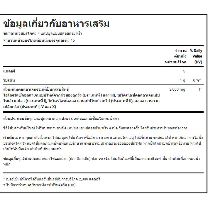 วิตามินโปรตีนคอลลาเจนรวม 5 ไทป์ Multi Collagen Type I, II, III, V, X ช่วยบำรุงเส้นผม หนังศรีษะ และเล็บให้แข็งแรงบํารุงรักษาผิว ผม เล็บ ให้แข็งแรง และช่วยในการรองรับข้อต่อ